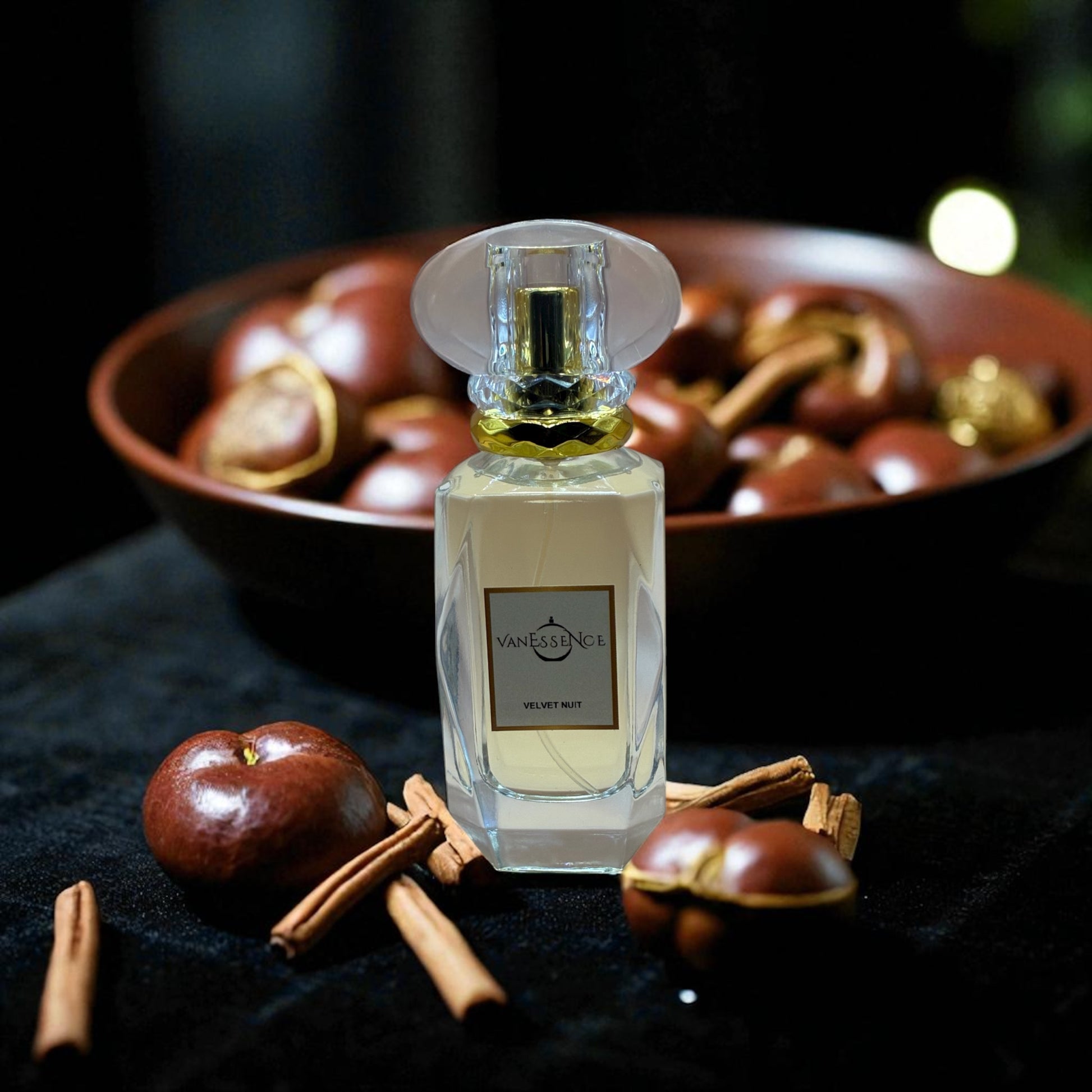Velvet Nuit evokes the contrast of flickering firelight and the softness of silk shadows. Spicy clove ignites the senses with a crisp spark, balanced by the rich, comforting depth of roasted chestnut. A soft vanilla note lingers subtly, like a whispered secret in the air. Crafted as a unisex fragrance ideal for winter evenings, urban environments, and intimate gatherings, Velvet Nuit surrounds you with elegant warmth and understated sophistication. This scent is suitable for all genders.